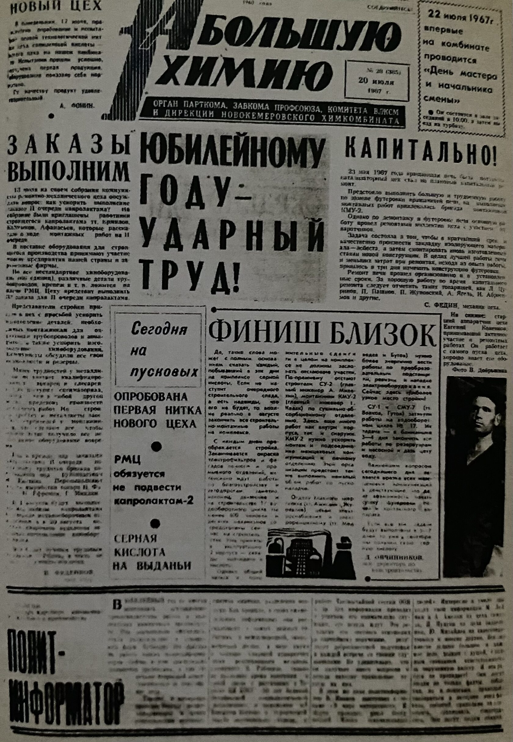 In October, the Decree of the Council of Ministers No. 3533 is issued: design specification for construction of Novo-Kemerovsky Chemical Works (NKHK). In accordance with the design specification, NKHK should start producing ammonia, nitric acid, ammonium nitrate, urea, and caprolactam from benzene. NKHK should supply mineral fertilizers to Siberia, Far East and partially Central Asia.